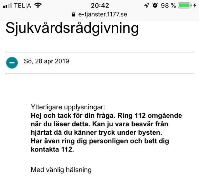 Men det malde i mitt huvud om det kunde varit hjärtat som spökade. Pappa dog ju plötsligt i hjärtinfarkt när han var 56 år. Skrev ett meddelande till 1177. De ringde upp mig direkt och uppmanade mig att ringa 112 direkt eftersom det var tryck under bysten och då kunde vara hjärtat.