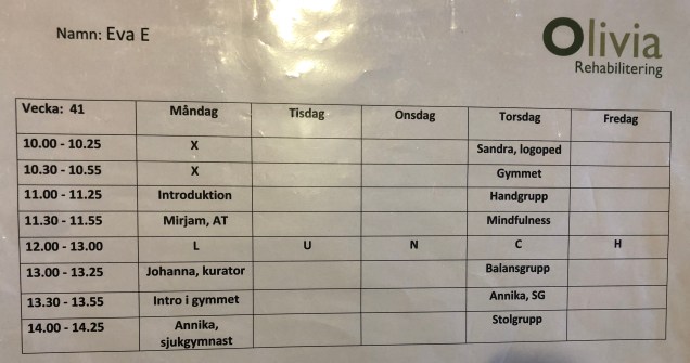 I ett sådant team kan man ha arbetsterapeut, sjukgymnast, kurator, logoped, rehabinstruktör och tillgång till läkare och sjuksköterska. Det här proffsiga gänget samarbetar och ser HELHETEN. Det är ett pussel av symtom och det gäller att få ihop helheten. Men det låter ju som en utopi, eller hur? I mitt fall heter utopin ”Olivia rehabilitering”. En dagrehabilitering där jag har alla de resurser jag behöver och där jag aktivt kan påverka innehållet. Det är inget schema som gäller för alla utan varje vecka sätts ett personligt schema samman. Utifrån individuella behov. Jag kan välja bort det som inte ger mig något och önska lägga till det som är aktuellt.