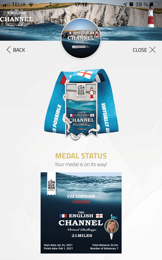 Vad hände då med engelska kanalen. Jo, jag antog en kul virtuell utmaning. Det finns en app som heter Conqueror med kända och olika långa sträckor att genomföra (dvs man går eller springer motsvarande sträckor). Den första sträckan är sammanlagt 33,8 km gjorde jag på en vecka. Ser fram emot Inca-leden till Machu Picchu. Den längsta sträckan är Route 66. Den vill jag fixa. Street views och fakta om platserna är lärorikt och sedan planteras träd för olika milstolpar. Den första sträckan innebar fem nya träd.